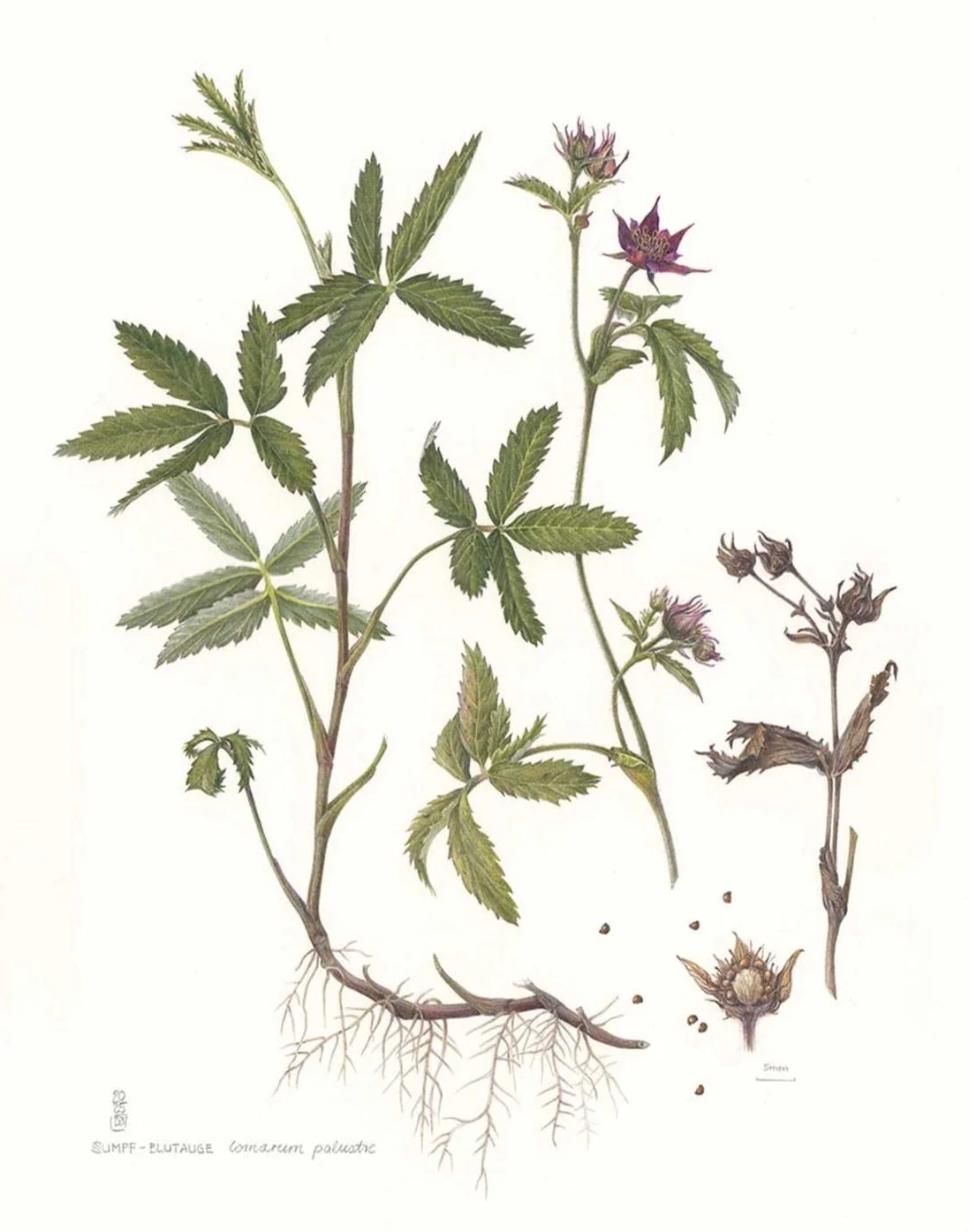 Sumpf-Blutauge, Potentilla palustris, Farbstift auf Papier, 37x46cm, 2024